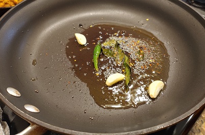 - Add curry leaves, green chilies and garlic cloves