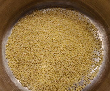 Millet is a sustainable crop that is resilient to drought and climate stress. It is therefore considered a staple of sustainable agriculture. I suggest to buy organic millet that can be purchased in bulk at a relatively low cost. Millet is an important food in the Ayurvedic tradition where is celebrated for its nutrient contents and recommended for weight management. Another advantage of millet is that it can be prepared fairly quickly and used in a variety of dishes. In this recipe we use foxtail millet.
