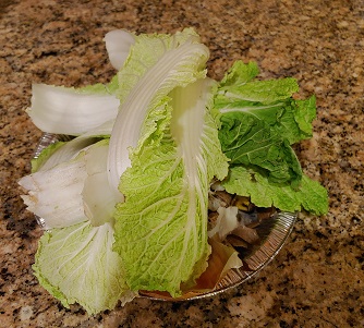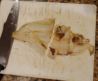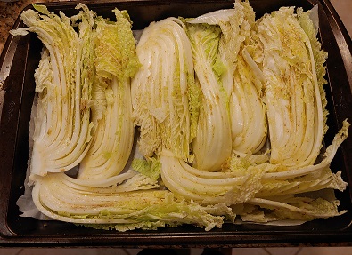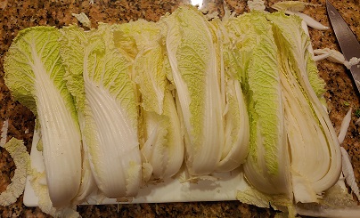Napa cabbage is quite large, and almost all of it, except for the hardest part can be used. It is enough to remove the outer layer of leaves, cut the cabbage in fourths or eights by the length (4 or 8 pieces depending on the size) and rinse under running water. If you compost, make this a zero waste recipe, don’t trash the leaves of the cabbage, they make excellent compost material.