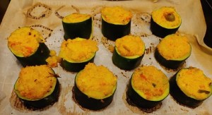 Cut zucchini in cylinders about 1 inch high and place them into a pot of water. Bring to a boil until the zucchini are softer, but not fully cooked (about 5-10 minutes).