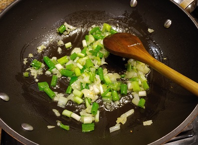 Add chopped scallions (or spinach leaves) and cook until tender, if using spinach make sure to use only a few dry leaves to avoid adding moisture