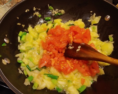Add the zucchini pulp, chopped tomatoes, tomato paste, salt, olives and capers.
