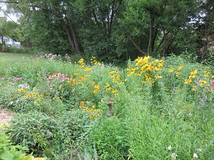 The eye opener for me came one day when I was going for a walk in the neighborhood and came across a road that was developed on one side and undeveloped on the other. The developed side had new homes surrounded by a luscious lawn of an intense green. The mulched areas were planted with flowers of almost a neon color that matched some of the house details, nothing was out of place, the whole view was studied to the detail. The undeveloped side in the front was filled with milkweed and other tall grasses and had the messy look of the summer prairie. When I stopped and listened, the developed part was dead silent, not a buzz to be heard, not a bug to be seen; the undeveloped side was a concert of sounds and voices of creatures living there. This was when the realization came to me, that my move into a suburban acre was forcing all the other creatures living there to move out or die. I was depriving many species of food and shelter and was poisoning the soil and water.