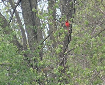 A couple of red cardinals enjoys the buckthorn-free wooded area in the backyard. Can you spot the female?